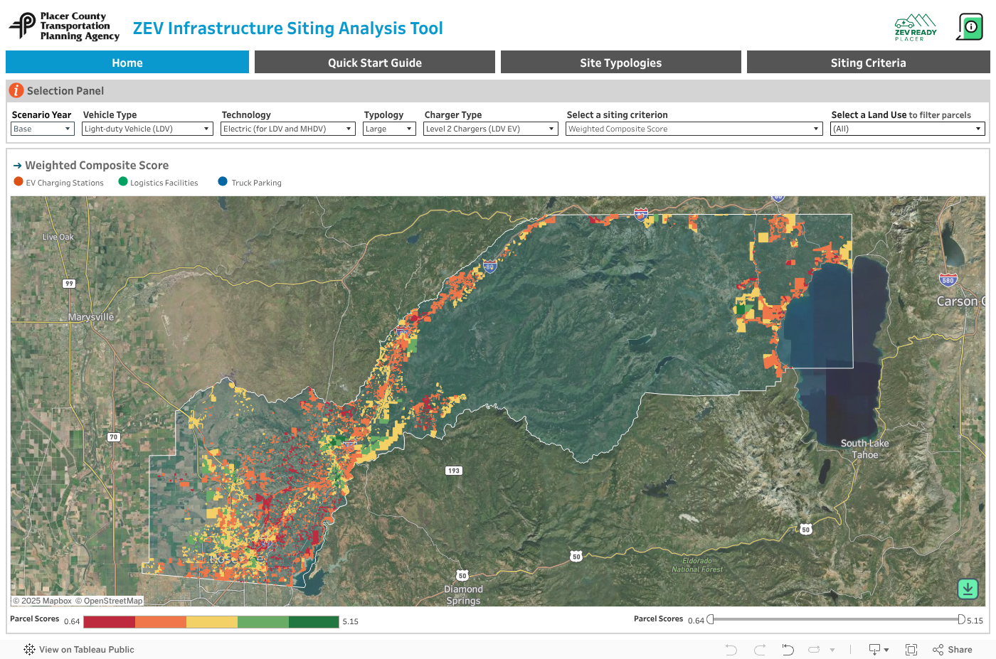This interactive tool supports the Placer County Zero Emission Vehicle (ZEV) Infrastructure Plan by identifying and evaluating potential sites for electric vehicle charging and hydrogen refueling infrastructure. The tool analyzes candidate parcels based on multiple criteria, including utilization, land availability, equity, grid capacity, and environmental conditions. Each parcel receives a score from 0-10, with higher scores indicating more favorable conditions. This planning resource helps guide strategic infrastructure decisions, though site-specific assessments and community input will be necessary before final siting decisions are made. If you are having issues with the map go here: bit.ly/ZEVMAP1